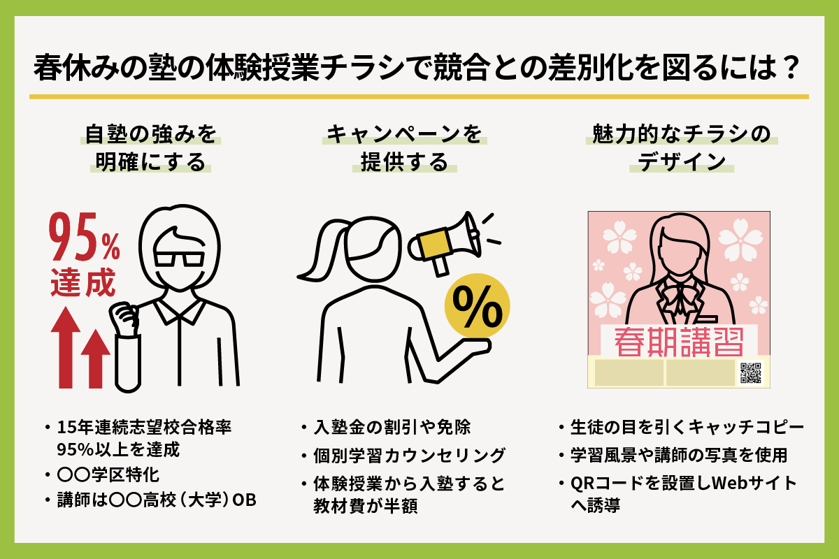 春休みの体験入塾を告知するチラシでは、競合他社との差別化が重要です。他塾と同じような内容では、生徒や保護者の関心を引くことができません。自塾ならではの魅力を前面に押し出し、他塾にはない特色をアピールすることが求められます。ここでは、競合他社との差別化を図るための3つの方法を紹介します。