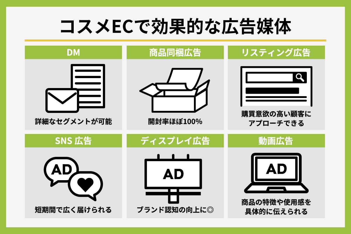 コスメEC市場で勝ち抜くには、数ある広告媒体の中から、自社の商品やターゲットに最適なものを選び、効果的に運用することが鍵を握ります。