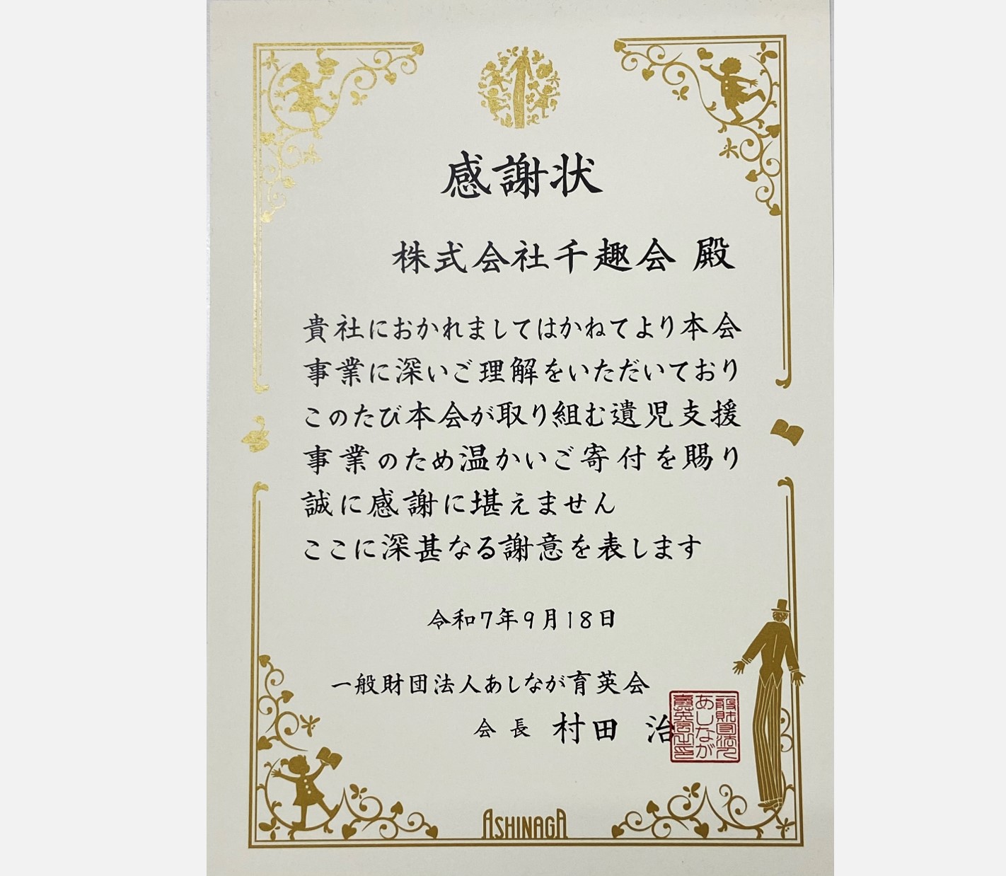 2024年12月に実施した寄付に対し、2025年9月18日、一般財団法人あしなが育英会会長より感謝状をいただきました。